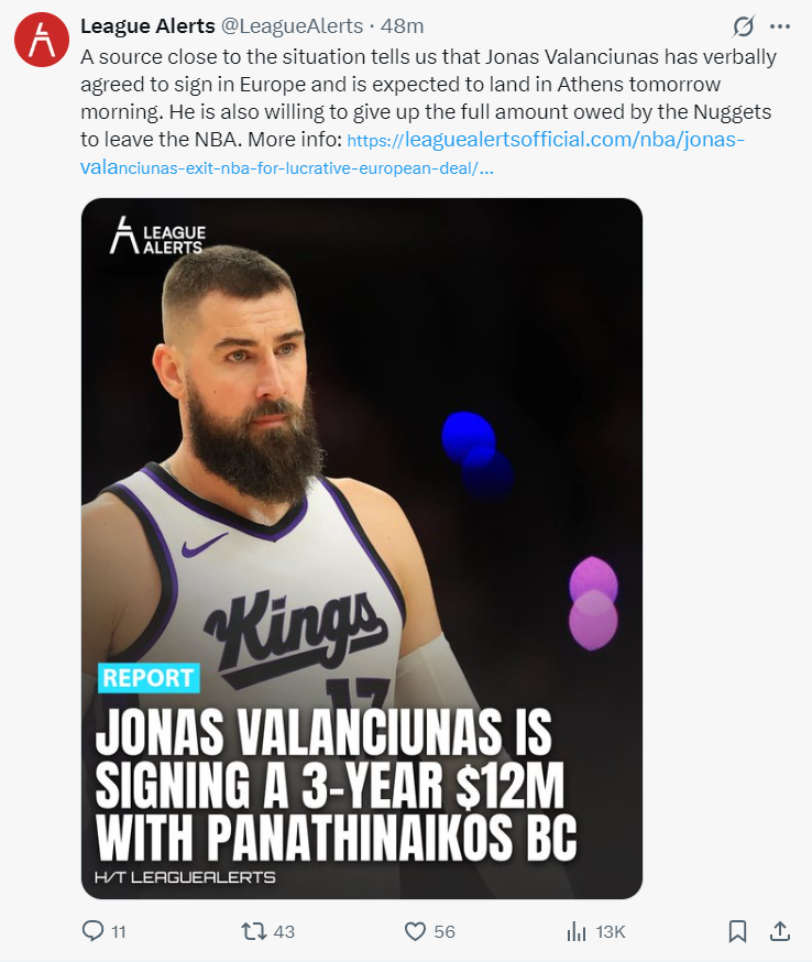 根据一小时之前的消息,国王掘金的交易已经达成无法取消,瓦兰已经属于掘金,掘金队正在努力说服瓦兰留在NBA,因为瓦兰是掘金今夏为约基奇找寻的最好替补,他上赛季场均16.9分钟,场均获得8.7分7篮板1.8助攻。如今来看说服失败了。