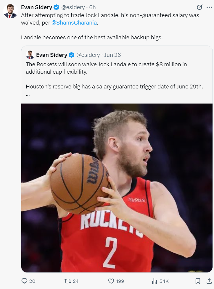 火箭队在早些时候也裁掉了来自澳大利亚的中锋兰代尔,他上赛季场均11分钟就能拿到4.8分3.3篮板,他还练出了三分投射能力,他本赛季是800万的不保障合同已经被裁,掘金如果签他肯定是底薪合同。这两人都是不错的补充。