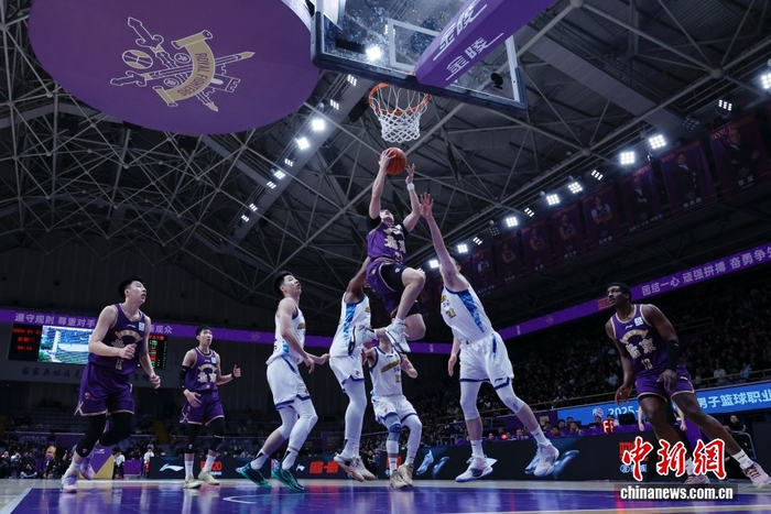 1月21日,在北京奥体中心体育馆举行的2025-2026中国男子篮球职业联赛(CBA)常规赛比赛中,北京控股队主场79比102负于浙江方兴渡队。图为北京控股队罗汉琛(紫衣,33号)在比赛中上篮。中新社记者 韩海丹 摄